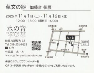 草文の器展 加藤音 個展 2025.10.28. 草文の器 加藤音 個展 会 期 令和7年11月1日(土)〜11月16日(日) 12時〜18時迄 (最終日は16時迄) 場 所 アートギャラリー・カフェ 水の音 (岐阜市新桜町) www.gallery-mizunooto.com